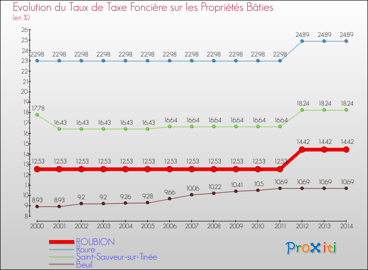 A Roubion, le taux de taxe foncière sur le bâti a donc augmenté de 15.08 % entre 2000 et 2014.
