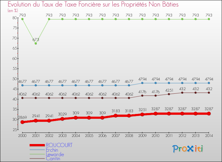 Pendant la même période, les communes françaises similaires à Roucourt, ont vu leur taux de taxe foncière sur le non bâti augmenter de 17.2 % en moyenne entre 2000 et 2014.