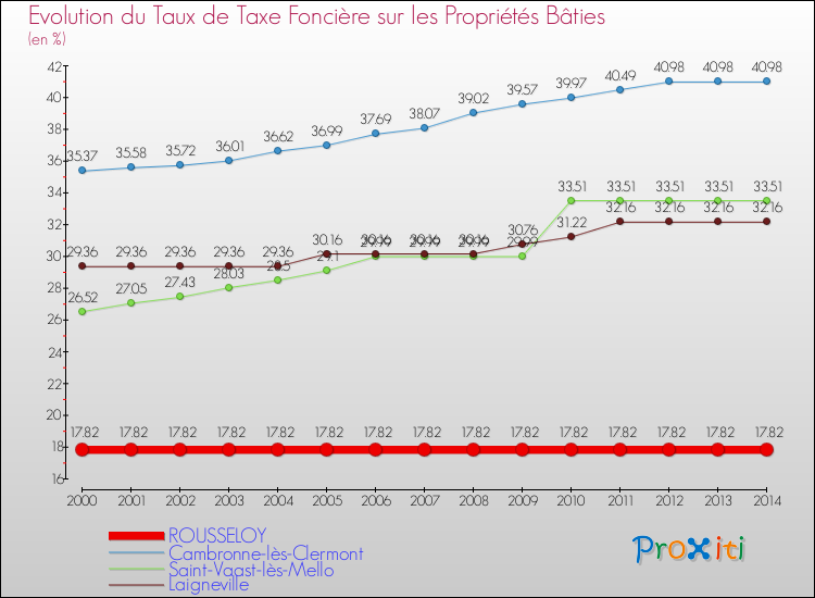 A Rousseloy, le taux de taxe foncière sur le bâti a donc augmenté de 0 % entre 2000 et 2014.