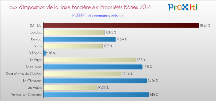 En 2014, le taux de la taxe foncière sur le bâti vôté par le conseil municipal de Ruffec était de : 18.27 %.