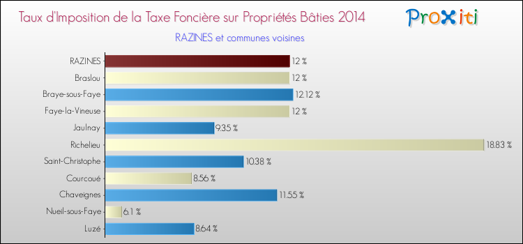 Vous trouverez ci-dessous des graphiques qui vous permettent de situer le taux de la taxe foncière sur le bâti de Razines par rapport aux communes voisines.