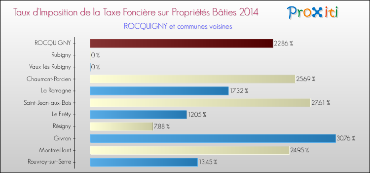 En 2014, le taux de la taxe foncière sur le bâti vôté par le conseil municipal de Rocquigny était de : 22.86 %.