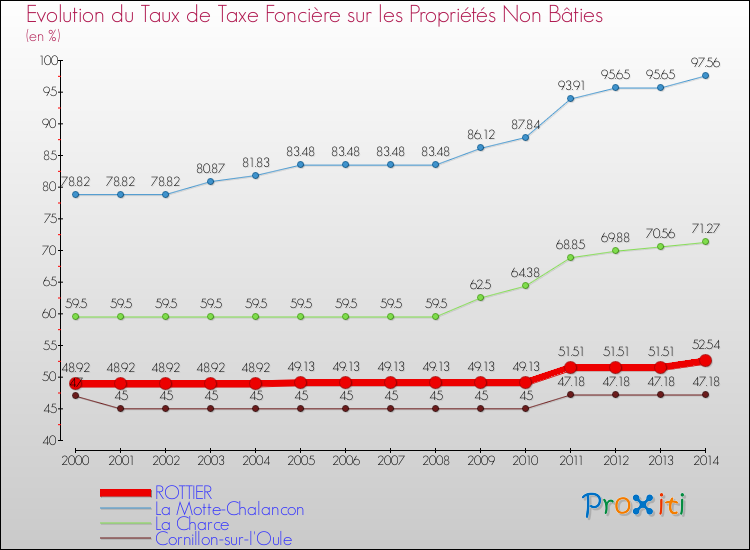 Pendant la même période, les communes françaises similaires à Rottier, ont vu leur taux de taxe foncière sur le non bâti augmenter de 0.37 % en moyenne entre 2000 et 2014.