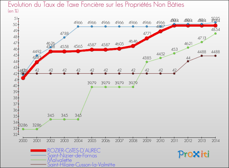 Pendant la même période, les communes françaises similaires à Rozier-Côtes-d'Aurec, ont vu leur taux de taxe foncière sur le non bâti augmenter de 27.3 % en moyenne entre 2000 et 2014.