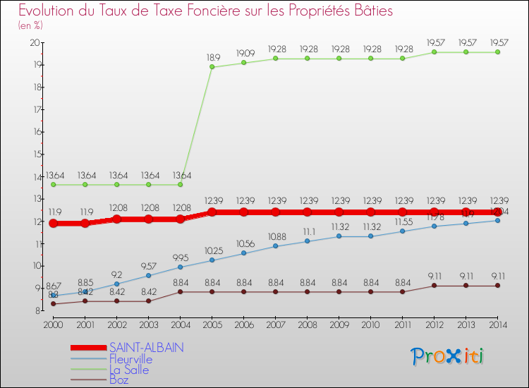 A Saint-Albain, le taux de taxe foncière sur le bâti a donc augmenté de 4.12 % entre 2000 et 2014.