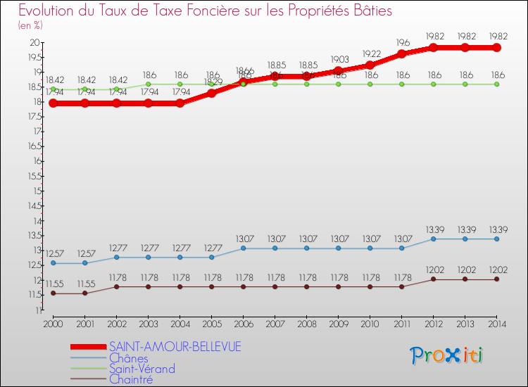 En 2014, le taux de la taxe foncière sur le bâti vôté par le conseil municipal de Saint-Amour-Bellevue était de : 19.82 %.