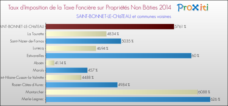 En 2014, le taux de la taxe foncière sur le non bâti vôté par le conseil municipal de Saint-Bonnet-le-Château était de : 57.61 %.