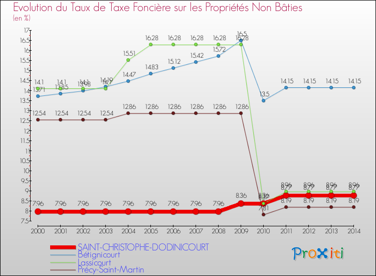 Pendant la même période, les communes françaises similaires à Saint-Christophe-Dodinicourt, ont vu leur taux de taxe foncière sur le non bâti baisser de 19.2 % en moyenne entre 2000 et 2014.
