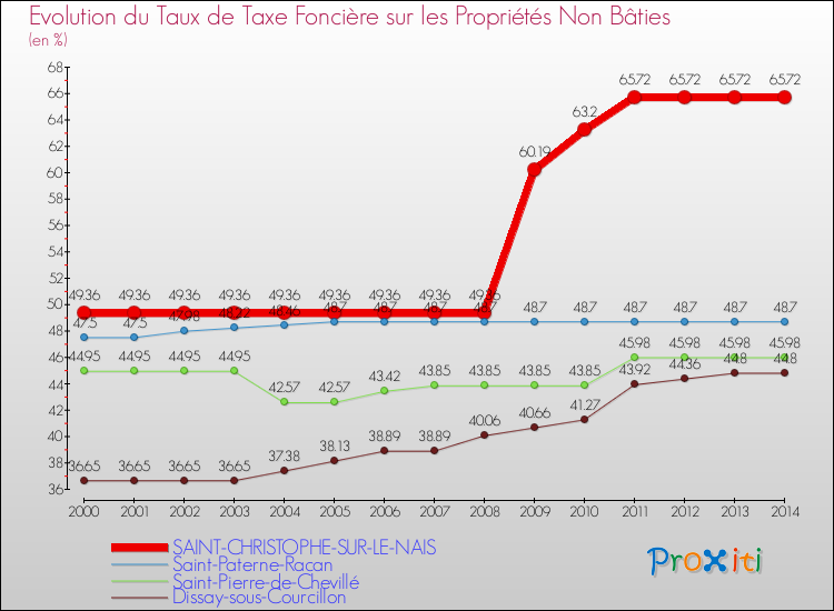 Pendant la même période, les communes françaises similaires à Saint-Christophe-sur-le-Nais, ont vu leur taux de taxe foncière sur le non bâti augmenter de 13.27 % en moyenne entre 2000 et 2014.