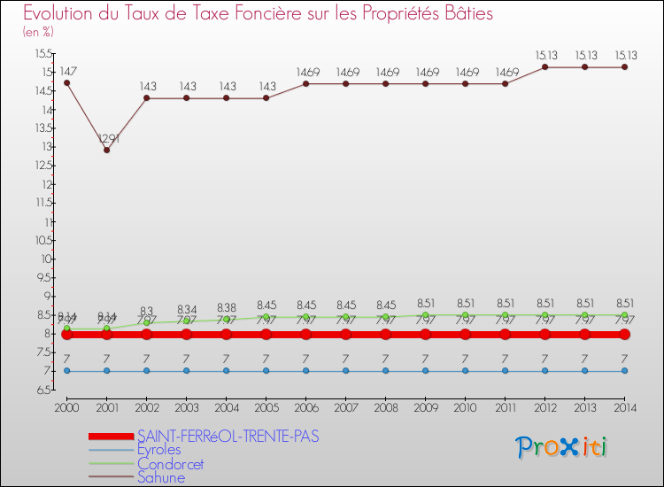 A Saint-Ferréol-Trente-Pas, le taux de taxe foncière sur le bâti a donc augmenté de 0 % entre 2000 et 2014.