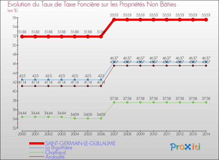 A Saint-Germain-le-Guillaume, le taux de taxe foncière sur le non bâti a ainsi augmenté de 7.04 % entre 2000 et 2014.
