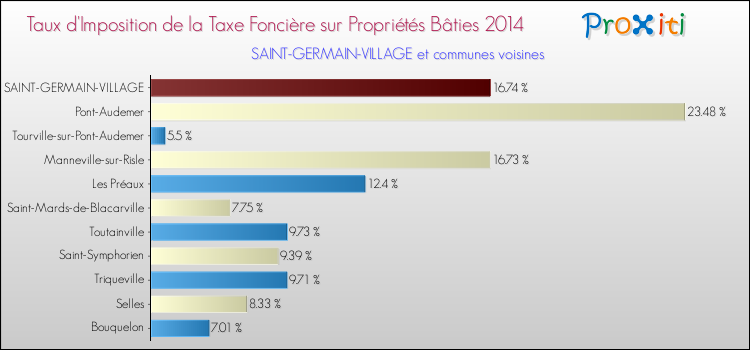 En 2014, le taux de la taxe foncière sur le bâti vôté par le conseil municipal de Saint-Germain-Village était de : 16.74 %.
