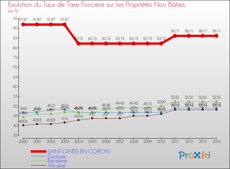 Le graphique ci dessous représente l'évolution du taux de la taxe foncière sur le non bâti à Saint-Gineis-en-Coiron depuis 2000.