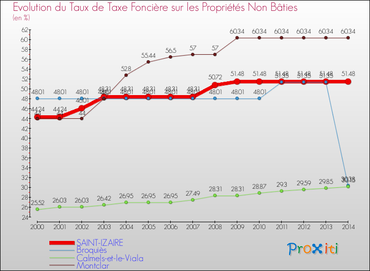 En 2014, le taux de la taxe foncière sur le non bâti vôté par le conseil municipal de Saint-Izaire était de : 51.48 %.