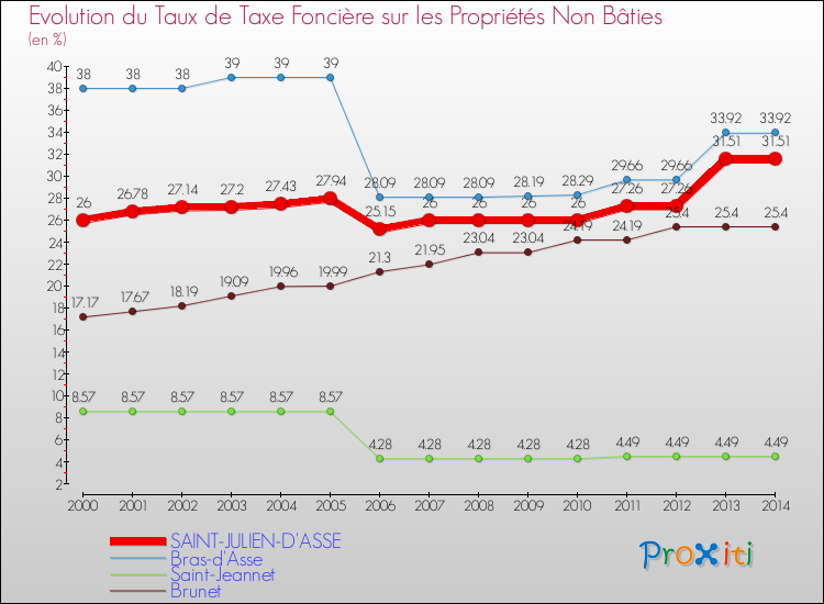Pendant la même période, les communes françaises similaires à Saint-Julien-d'Asse, ont vu leur taux de taxe foncière sur le non bâti augmenter de 19.53 % en moyenne entre 2000 et 2014.