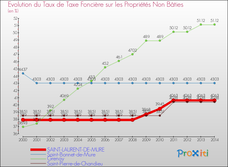 Pendant la même période, les communes françaises similaires à Saint-Laurent-de-Mure, ont vu leur taux de taxe foncière sur le non bâti augmenter de 37.14 % en moyenne entre 2000 et 2014.