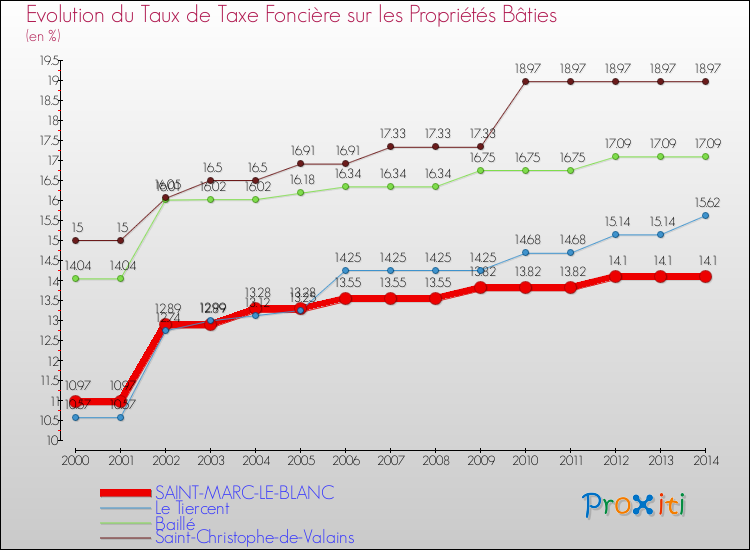 A Saint-Marc-le-Blanc, le taux de taxe foncière sur le bâti a donc augmenté de 28.53 % entre 2000 et 2014.