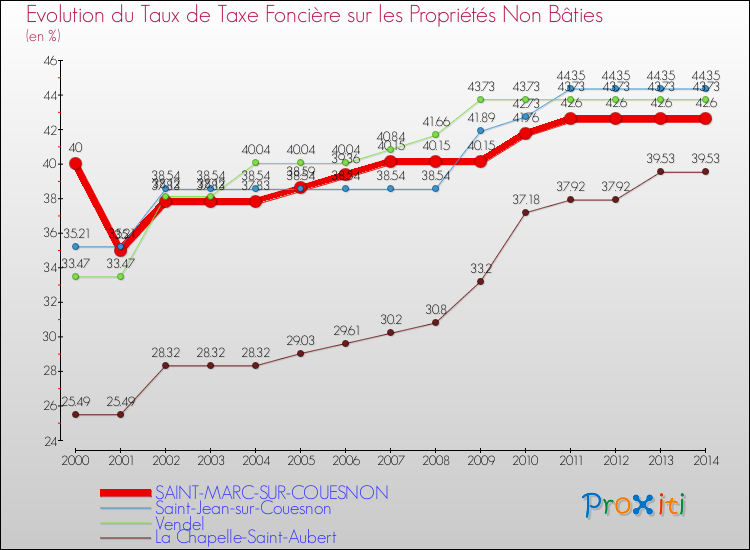 Pendant la même période, les communes françaises similaires à Saint-Marc-sur-Couesnon, ont vu leur taux de taxe foncière sur le non bâti augmenter de 44.7 % en moyenne entre 2000 et 2014.