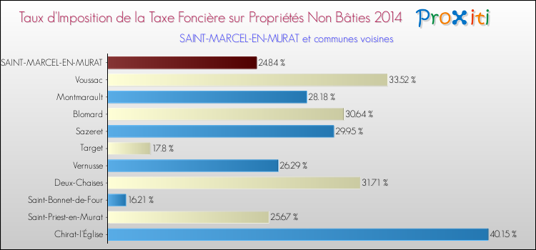 Vous trouverez ci-dessous des graphiques qui vous permettent de situer le taux de la taxe foncière sur le non bâti de Saint-Marcel-en-Murat par rapport aux communes voisines.