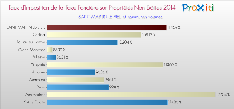 En 2014, le taux de la taxe foncière sur le non bâti vôté par le conseil municipal de Saint-Martin-le-Vieil était de : 114.59 %.
