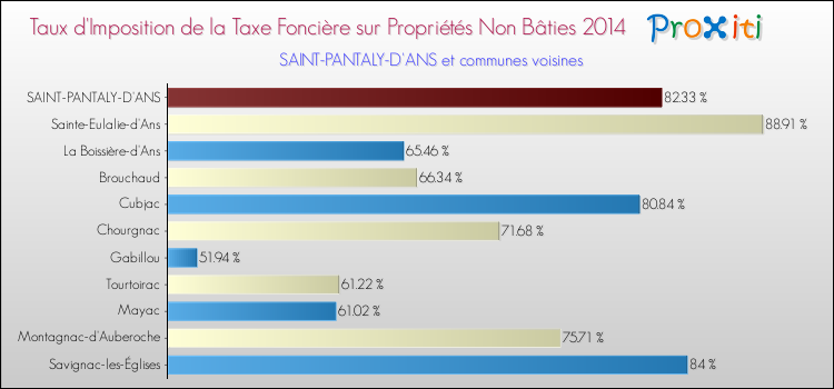 En 2014, le taux de la taxe foncière sur le non bâti vôté par le conseil municipal de Saint-Pantaly-d'Ans était de : 82.33 %.