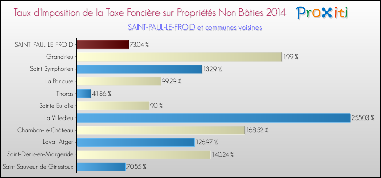 En 2014, le taux de la taxe foncière sur le non bâti vôté par le conseil municipal de Saint-Paul-le-Froid était de : 73.04 %.