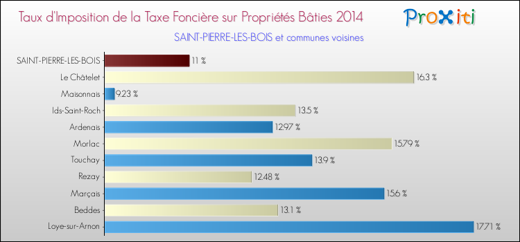 Pendant la même période, les communes françaises similaires à Saint-Pierre-les-Bois, ont vu leur taux de taxe foncière sur le bâti augmenter de 10.76 % en moyenne entre 2000 et 2014.