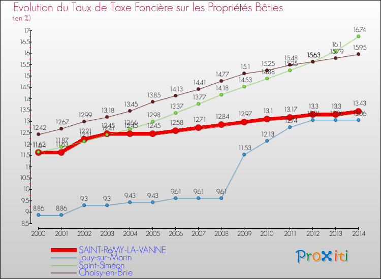 Pendant la même période, les communes françaises similaires à Saint-Rémy-la-Vanne, ont vu leur taux de taxe foncière sur le bâti augmenter de 17.8 % en moyenne entre 2000 et 2014.