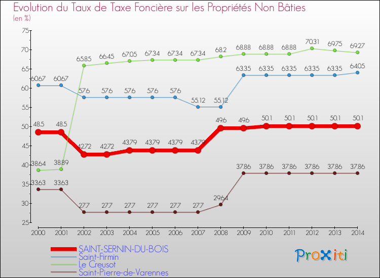 Pendant la même période, les communes françaises similaires à Saint-Sernin-du-Bois, ont vu leur taux de taxe foncière sur le non bâti augmenter de 13.27 % en moyenne entre 2000 et 2014.