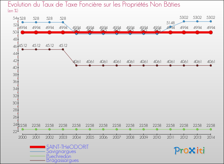 En 2014, le taux de la taxe foncière sur le non bâti vôté par le conseil municipal de Saint-Théodorit était de : 49.94 %.