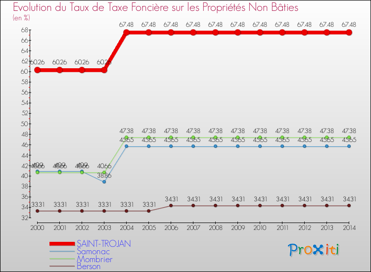 En 2014, le taux de la taxe foncière sur le non bâti vôté par le conseil municipal de Saint-Trojan était de : 67.48 %.