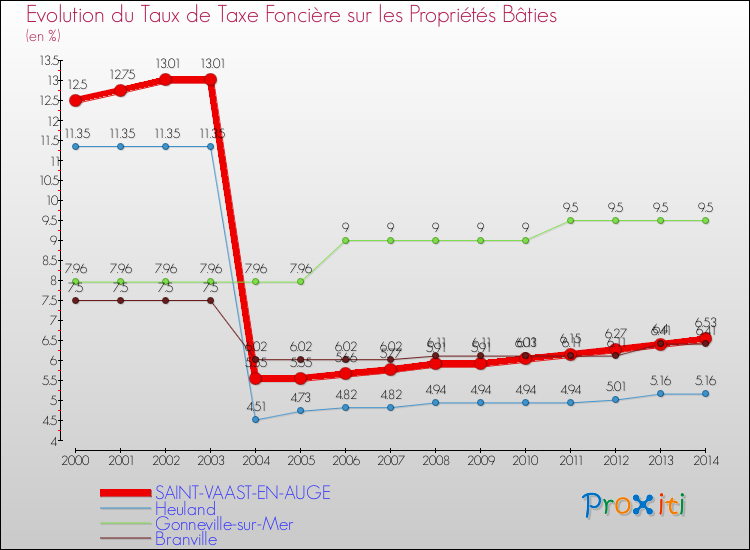 A Saint-Vaast-en-Auge, le taux de taxe foncière sur le bâti a donc baissé de 47.76 % entre 2000 et 2014.