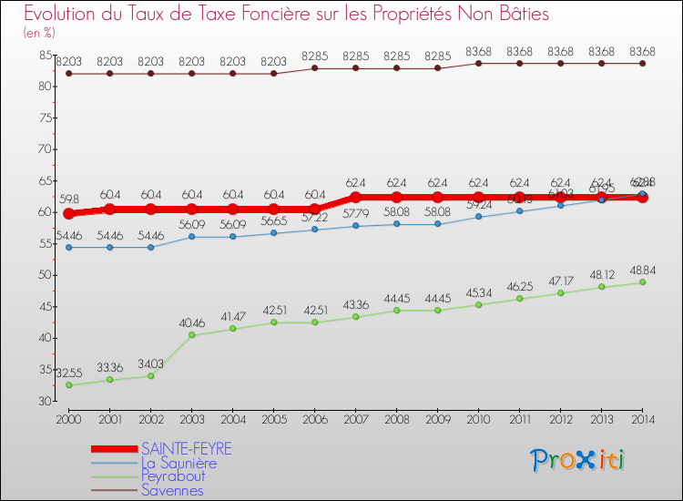Pendant la même période, les communes françaises similaires à Sainte-Feyre, ont vu leur taux de taxe foncière sur le non bâti augmenter de 38.26 % en moyenne entre 2000 et 2014.