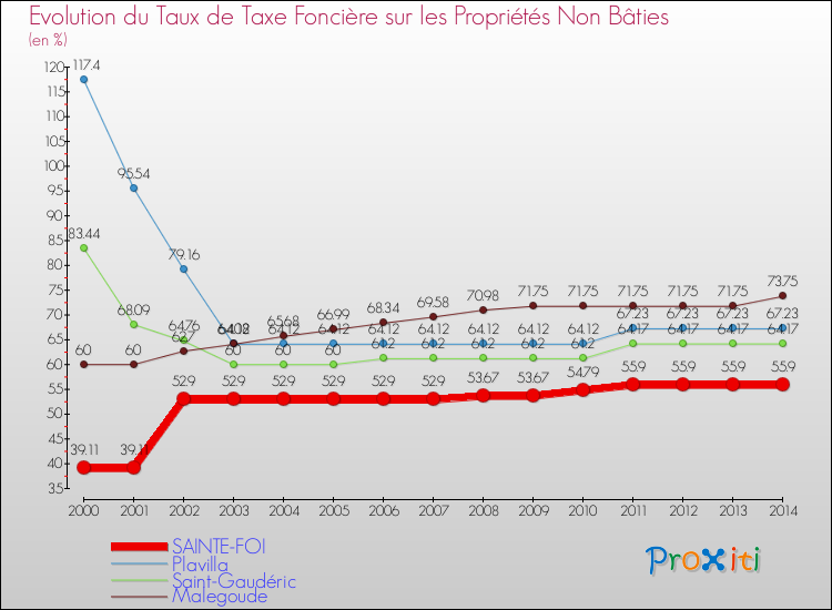 A Sainte-Foi, le taux de taxe foncière sur le non bâti a ainsi augmenté de 42.93 % entre 2000 et 2014.