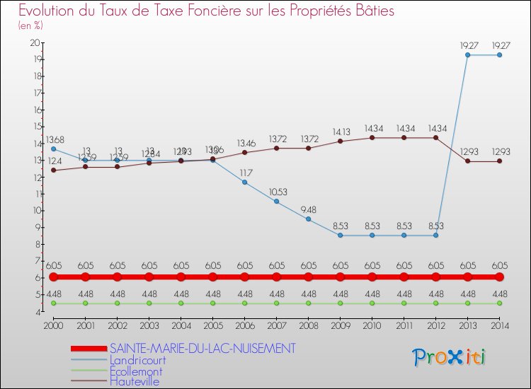 Pendant la même période, les communes françaises similaires à Sainte-Marie-du-Lac-Nuisement, ont vu leur taux de taxe foncière sur le bâti augmenter de 27 % en moyenne entre 2000 et 2014.