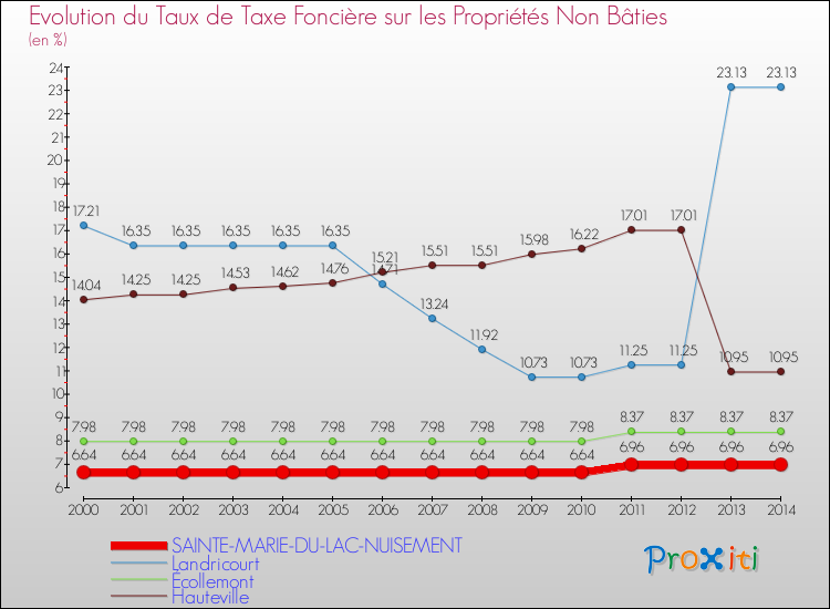 Pendant la même période, les communes françaises similaires à Sainte-Marie-du-Lac-Nuisement, ont vu leur taux de taxe foncière sur le non bâti augmenter de 14.22 % en moyenne entre 2000 et 2014.