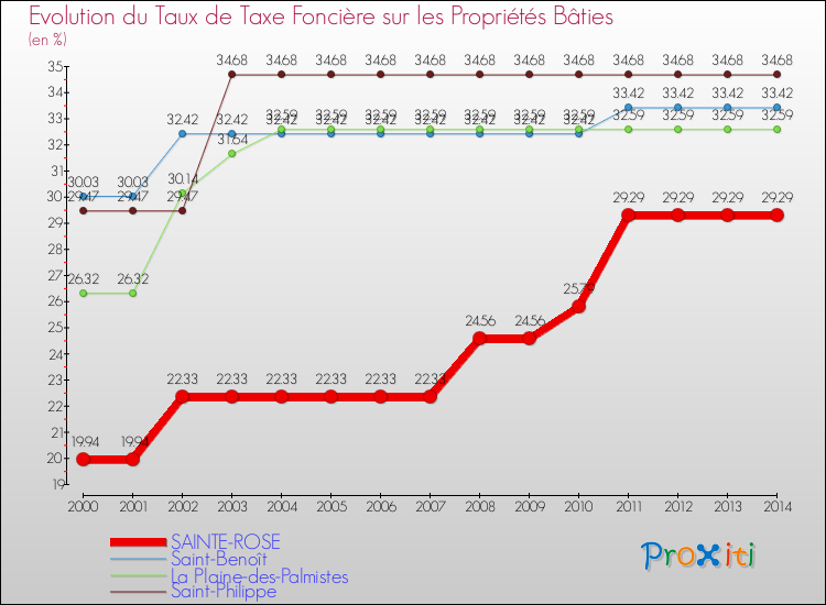 Pendant la même période, les communes françaises similaires à Sainte-Rose, ont vu leur taux de taxe foncière sur le bâti augmenter de 19.32 % en moyenne entre 2000 et 2014.