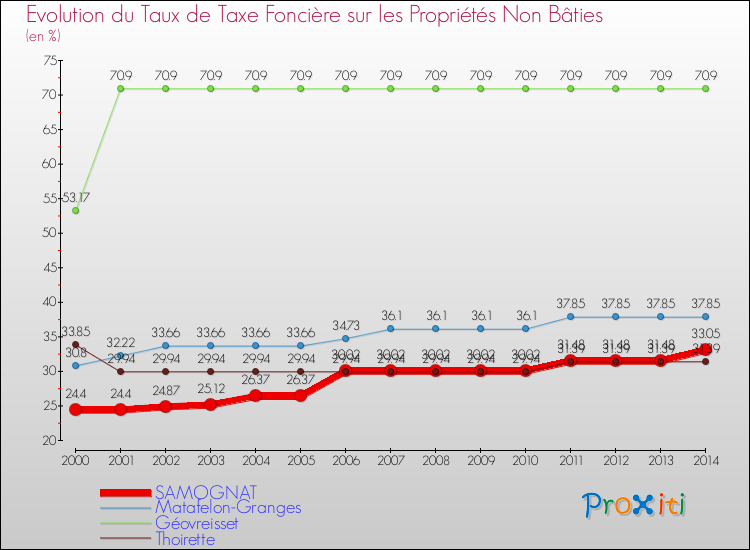 Pendant la même période, les communes françaises similaires à Samognat, ont vu leur taux de taxe foncière sur le non bâti augmenter de 44.7 % en moyenne entre 2000 et 2014.