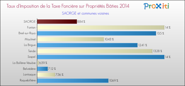Pendant la même période, les communes françaises similaires à Saorge, ont vu leur taux de taxe foncière sur le bâti augmenter de 10.76 % en moyenne entre 2000 et 2014.