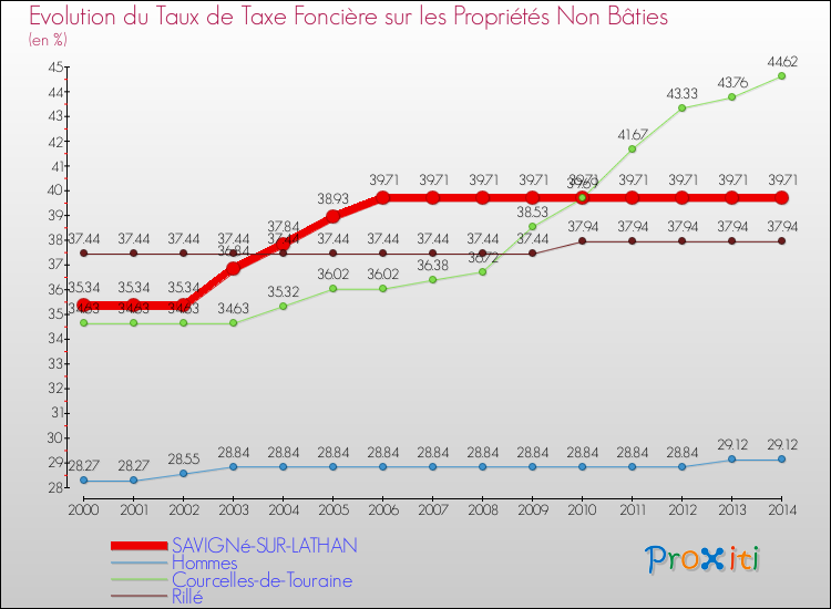 Pendant la même période, les communes françaises similaires à Savigné-sur-Lathan, ont vu leur taux de taxe foncière sur le non bâti augmenter de 24.79 % en moyenne entre 2000 et 2014.