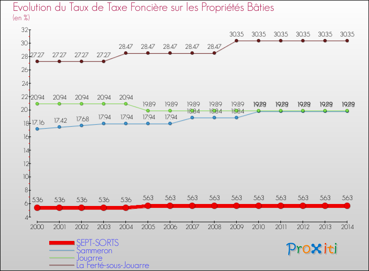 A Sept-Sorts, le taux de taxe foncière sur le bâti a donc augmenté de 5.04 % entre 2000 et 2014.