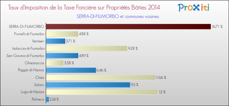 En 2014, le taux de la taxe foncière sur le bâti vôté par le conseil municipal de Serra-di-Fiumorbo était de : 16.71 %.