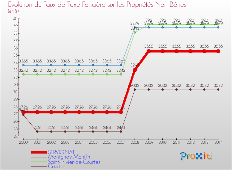 Pendant la même période, les communes françaises similaires à Servignat, ont vu leur taux de taxe foncière sur le non bâti augmenter de 48.47 % en moyenne entre 2000 et 2014.
