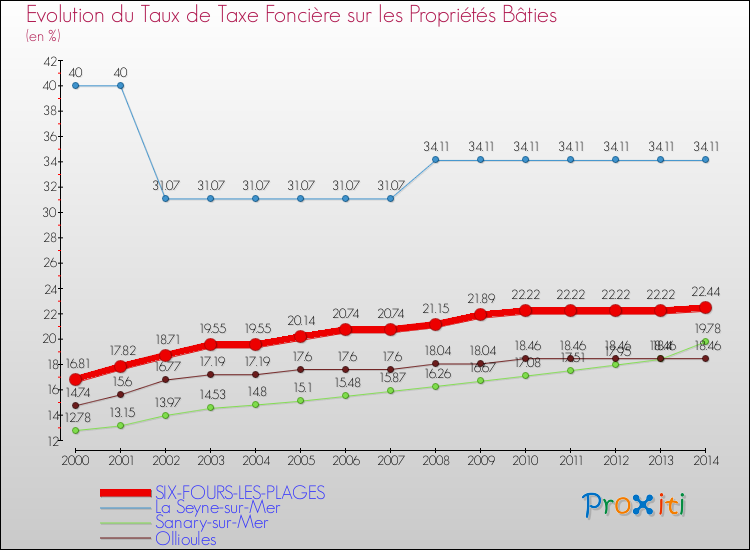 Pendant la même période, les communes françaises similaires à Six-Fours-les-Plages, ont vu leur taux de taxe foncière sur le bâti augmenter de 35.58 % en moyenne entre 2000 et 2014.