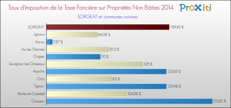 En 2014, le taux de la taxe foncière sur le non bâti vôté par le conseil municipal de Sorgeat était de : 159.45 %.