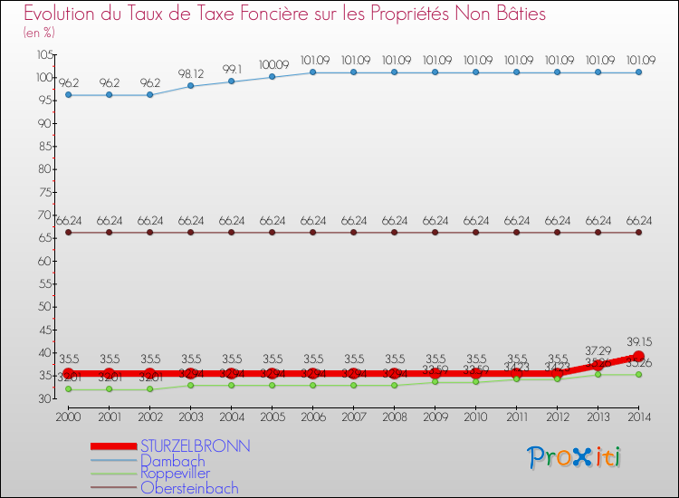 Pendant la même période, les communes françaises similaires à Sturzelbronn, ont vu leur taux de taxe foncière sur le non bâti augmenter de 41.31 % en moyenne entre 2000 et 2014.