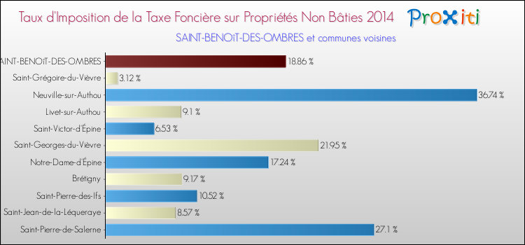 Vous trouverez ci-dessous des graphiques qui vous permettent de situer le taux de la taxe foncière sur le non bâti de Saint-Benoît-des-Ombres par rapport aux communes voisines.