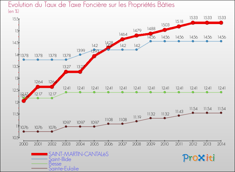 A Saint-Martin-Cantalès, le taux de taxe foncière sur le bâti a donc augmenté de 27.33 % entre 2000 et 2014.