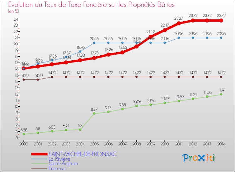 A Saint-Michel-de-Fronsac, le taux de taxe foncière sur le bâti a donc augmenté de 47.7 % entre 2000 et 2014.