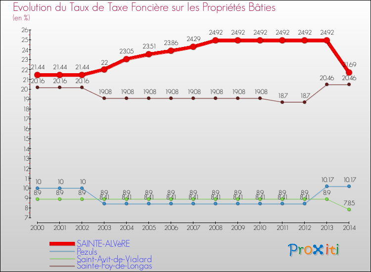 A Sainte-Alvère, le taux de taxe foncière sur le bâti a donc augmenté de 1.17 % entre 2000 et 2014.